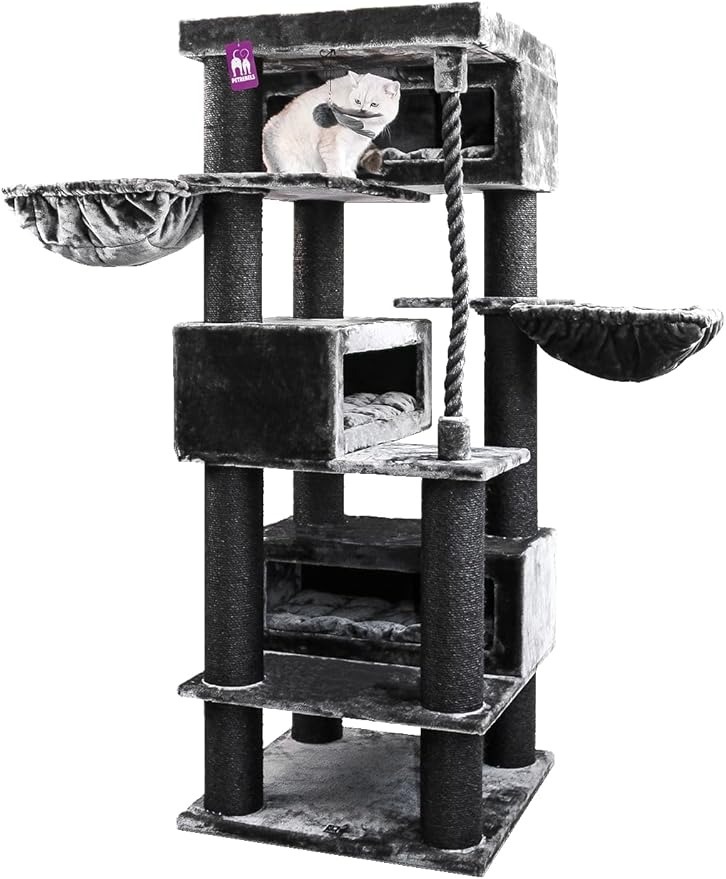 Design & Ausstattung: Enthält 2 gemütliche Höhlen, 2 gepolsterte Plattformen, eine Plüschhängematte und 10 Sisal-Kratzpfosten.